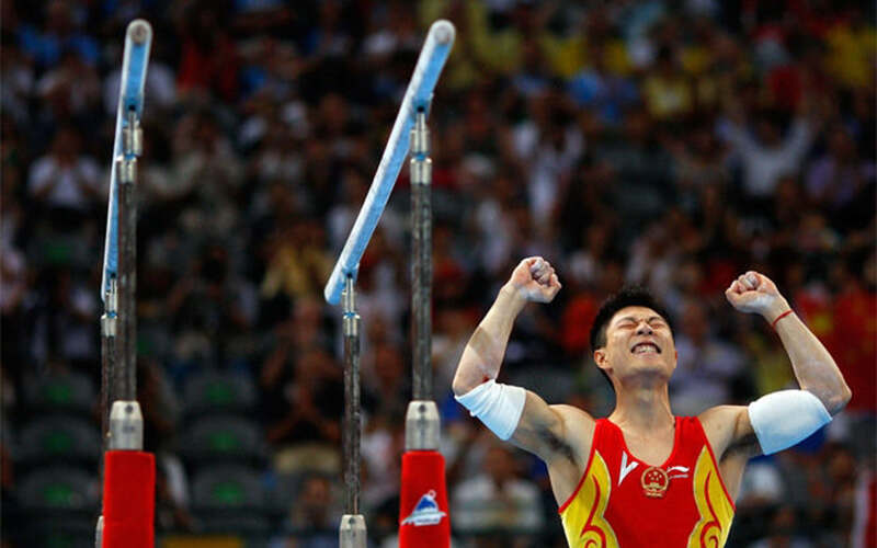 李小鹏在泰山器材上夺得男子体操双杠冠军